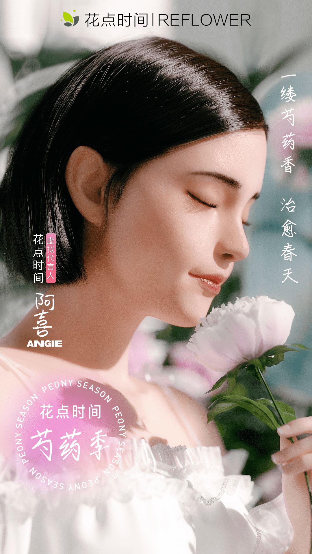 4月13日,国内领先鲜花生活方式品牌花点时间宣布虚拟偶像阿喜Angie为品牌「2022年度虚拟代言人」,并在元宇宙开设第一家品牌花店。同一天,花点时间发布由阿喜出镜的芍药季概念短视频。花点时间通过阿喜这一来自多元宇宙的IP人物,打破虚拟空间与现实世界的界限,不断向Z世代人群渗透,将鲜花生活美学植入元宇宙这个新文明。