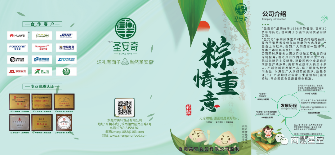 据悉,圣安奇品牌创始于1998年的香港,至今已有20多年的历史,现隶属于东莞市美轩食品有限公司。圣安奇系列月饼是公司重点打造的品牌,致力于为消费者提供美味健康的各式月饼。产品自上市以来,受到广大消费者一致好评,在本土市场具有良好口碑。公司同时承接各大酒店月饼加工及企业月饼定制服务,引进具有国内先进水平生产线,配以先进的主控制器、建设现代化食品自动成形生产线多条,拥有专业技术人员三十多人,不断创新研发新产品。现正研发各种休闲食品,以满足广大消费者的需求。