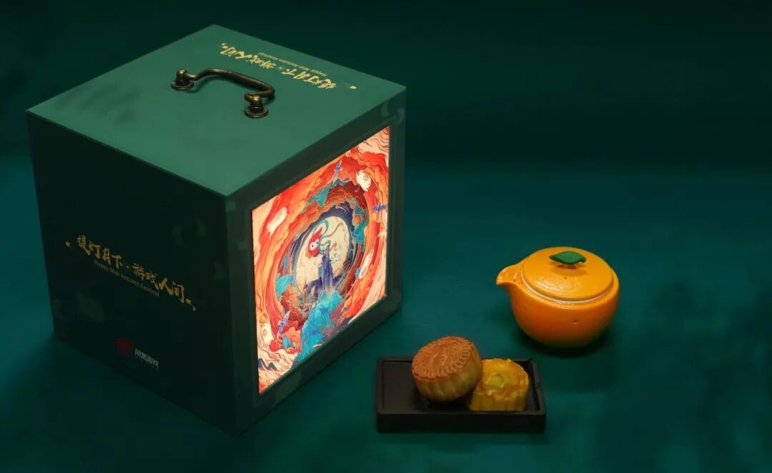 网易中秋月饼的设计以透光的方形灯笼为正面造型,烛光之间,是网易所在的城市地标。