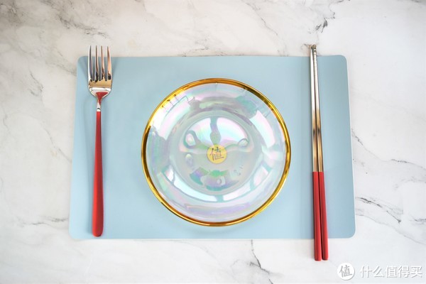 ▲拆下长方形盒子,具体来说扑面而来的是一套金属筷子和叉子,算是中西合璧了。后方黑配备了一个透明的七彩琉璃盘,此盘子可不一般,在不同光线和角度下能绽放出绚丽多彩的光芒,很神奇哦,盘边也进行了金色描边,尾端位置活页有值得称赞买LOGO,结构设计很有特色。