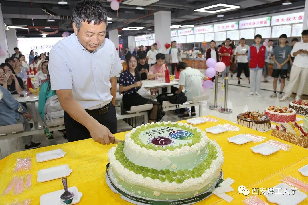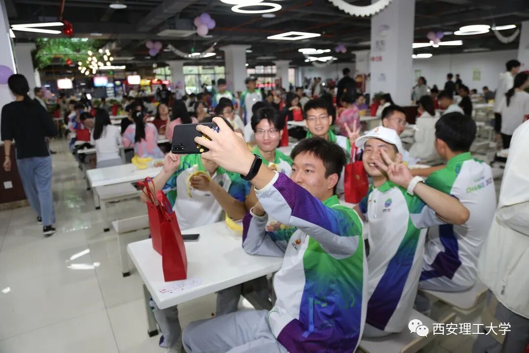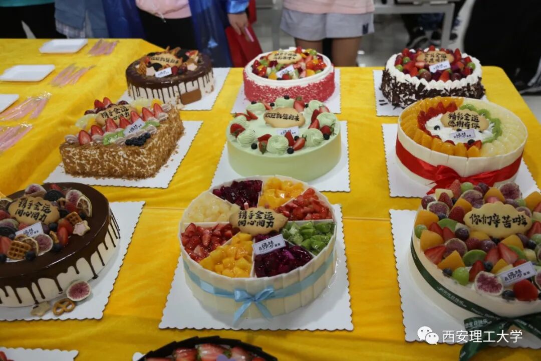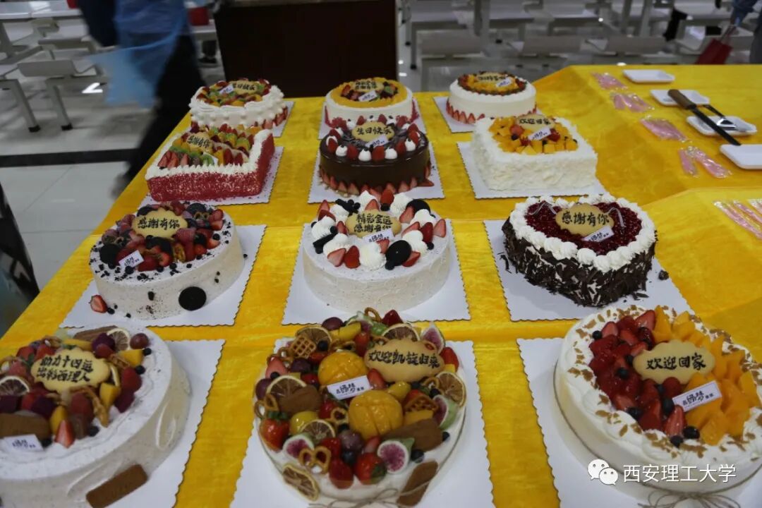 午饭时间,我校曲江校区第五食堂挂满了五彩缤纷的气球和一排排的彩旗,每个餐桌前摆放了新鲜的水果,在食堂的中间位置还摆放了印有学校LOGO的自制的生日蛋糕,为9月份过生日的学生群众演员集体庆生。满满的仪式感,只为迎接他们回家。