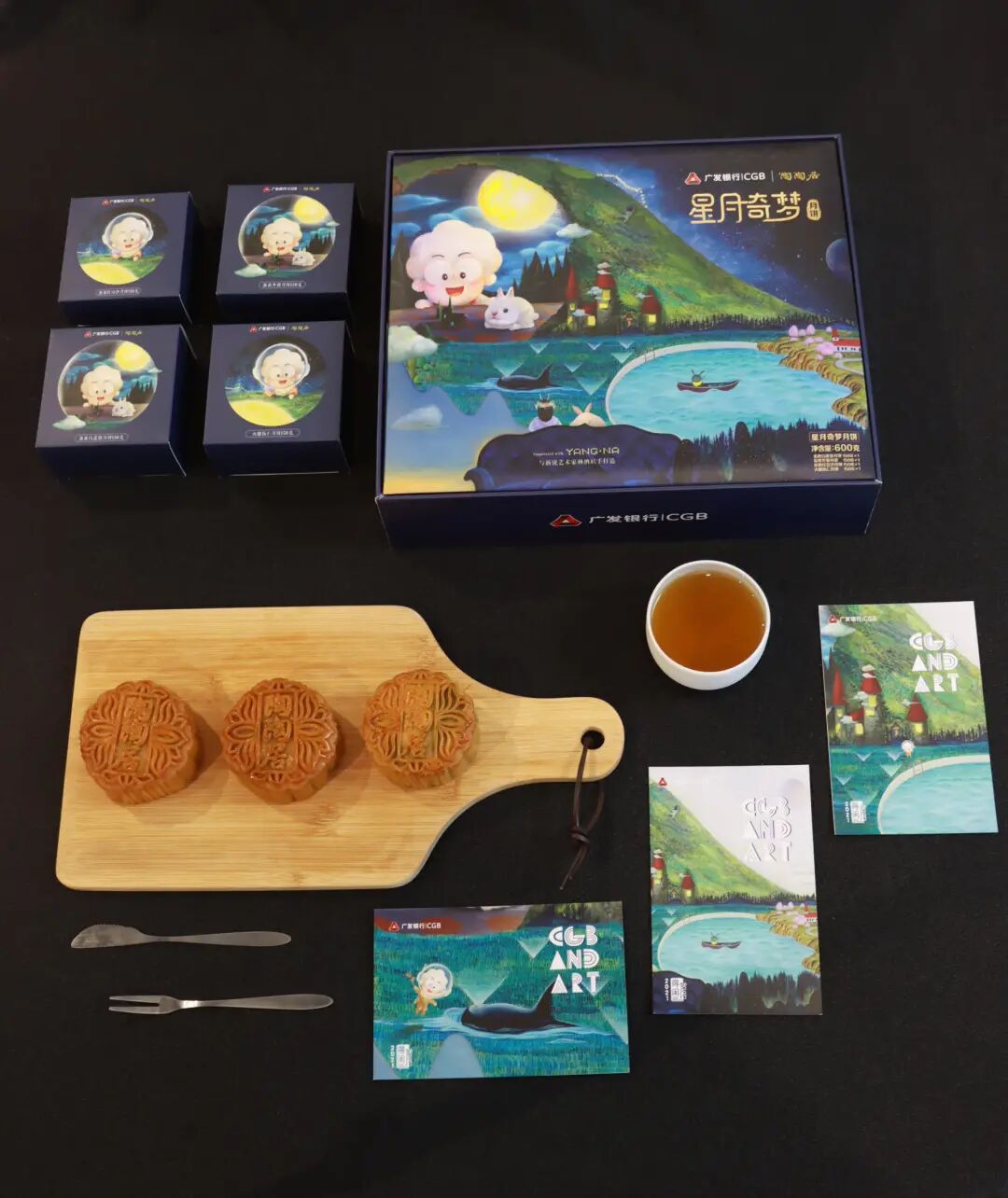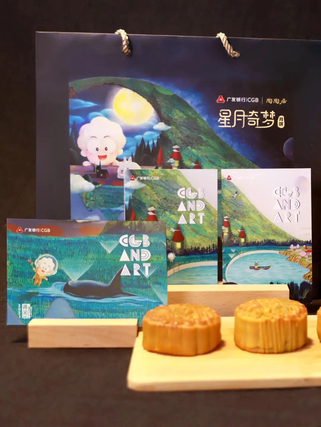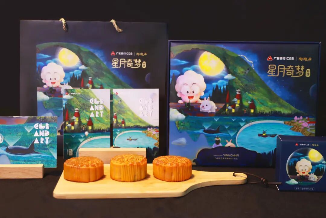 广发信用卡品牌IP小发羊与陶陶居携手超现实主义艺术家杨纳,结构设计出【星月奇梦】主题中秋月饼。