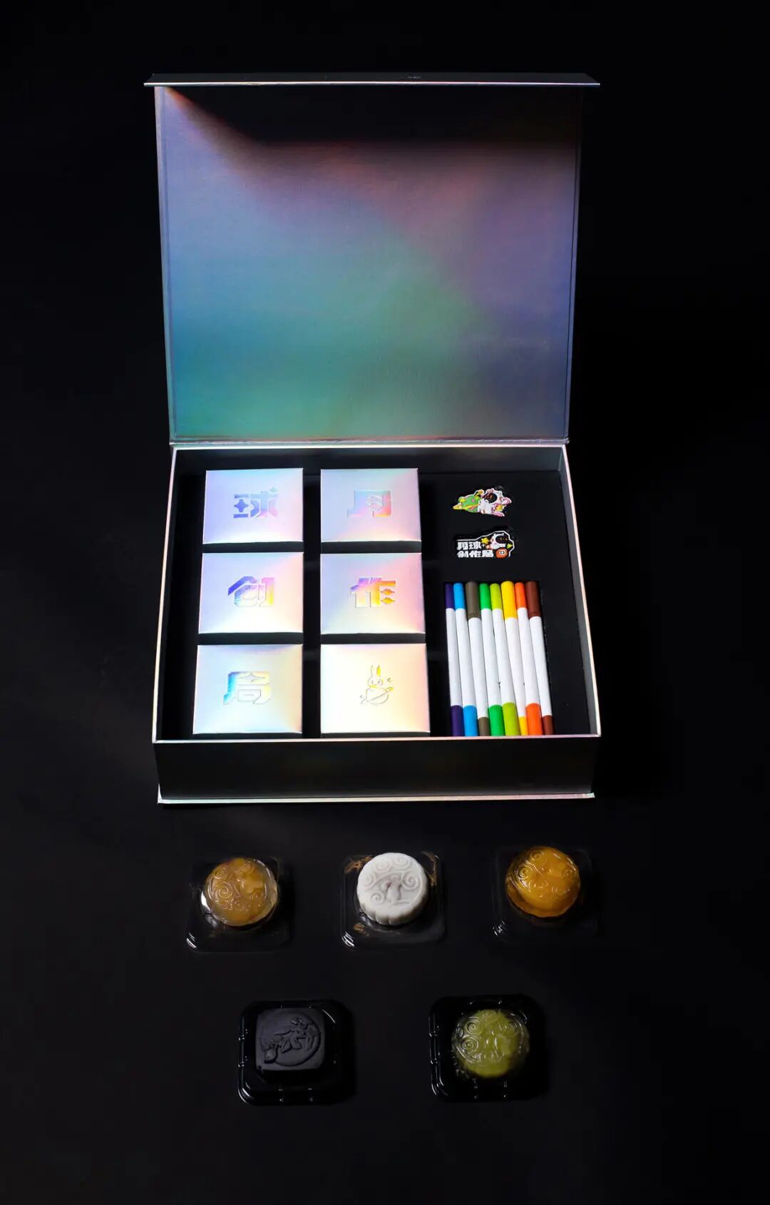 月饼中,除了六枚月饼外,还包含一个月球创作灵感包,一张涂色卡及彩笔、两个小影酱中秋限定冰箱贴。
