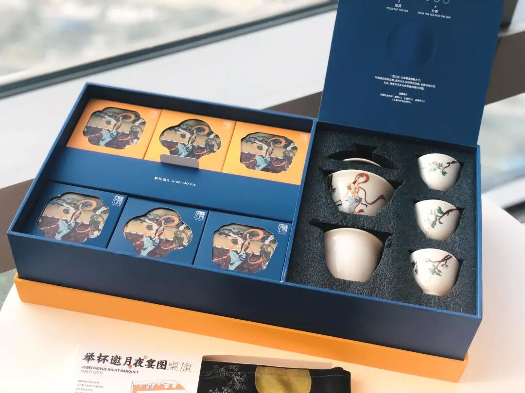 李子柒的【举杯邀月】月饼,外观是一幅兔仙版夜宴图,月饼内还有兔仙夜宴版桌旗和一套精美的茶杯套装,并装有6枚不同口味的月饼,东方味十足。
