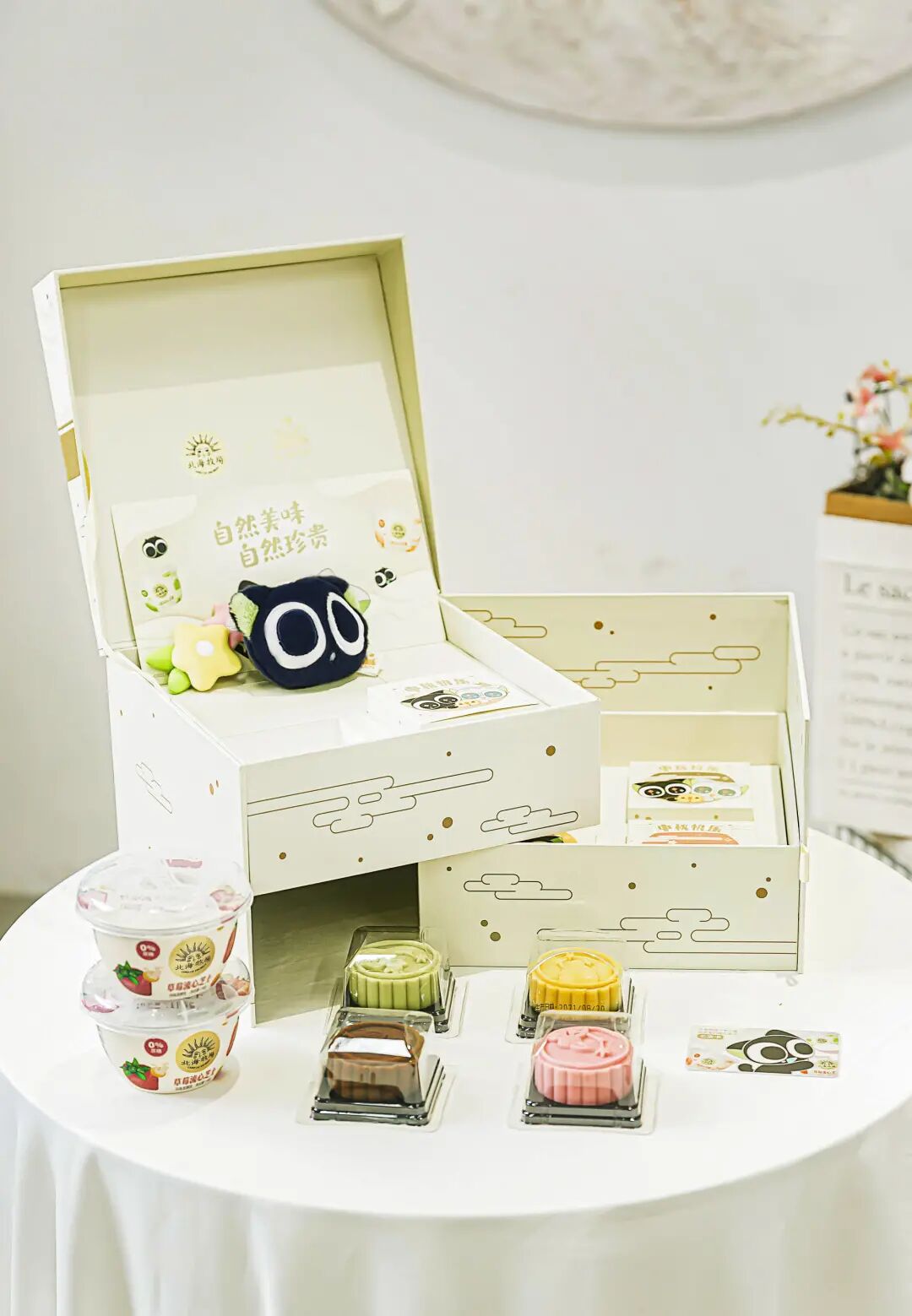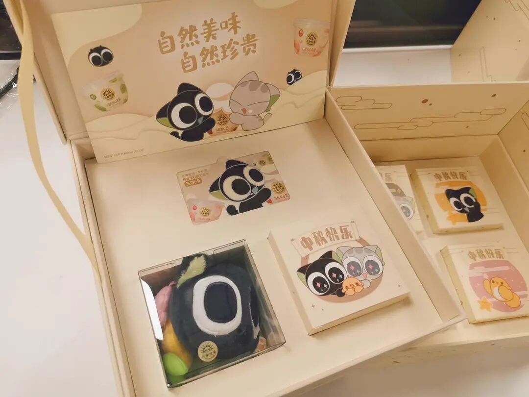 北海牧场和时趣代理商以自然美味 自然珍贵为主题,合作软萌国漫IP罗小黑,打造联名月饼。