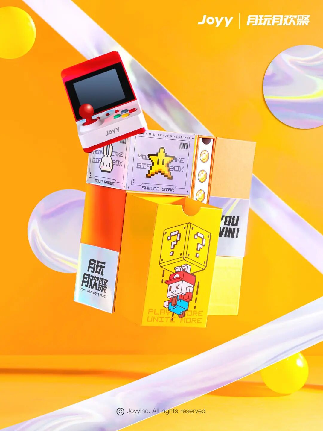 月饼中含迷你复古街机一只,内盒则采用方块、金币、管道等像素风游戏元素组合成盲盒。