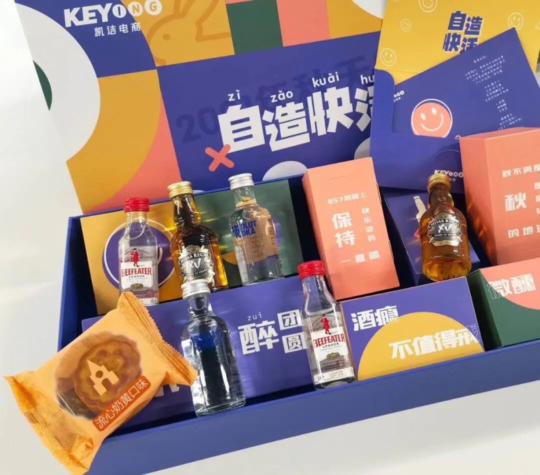 凯诘电商推出月饼【自造快活】,将便利店调酒和流心月饼跨界组合,拆盲盒拆出微醺快乐~