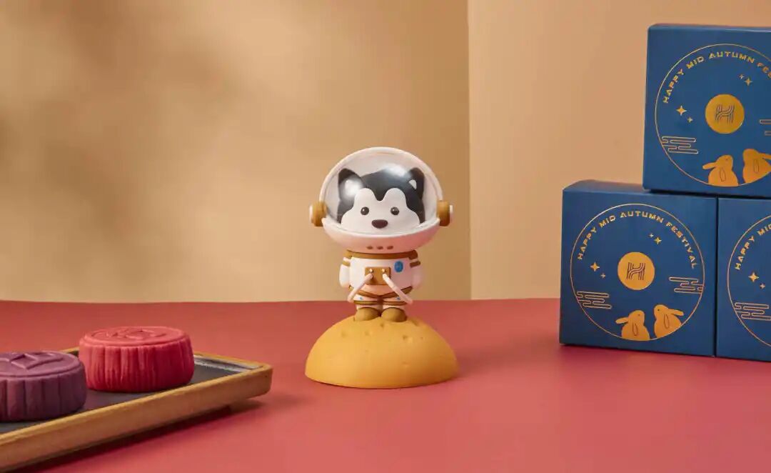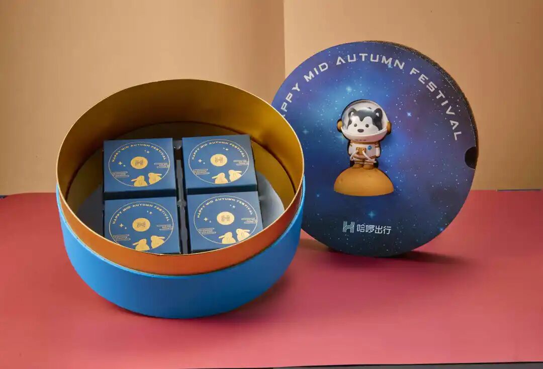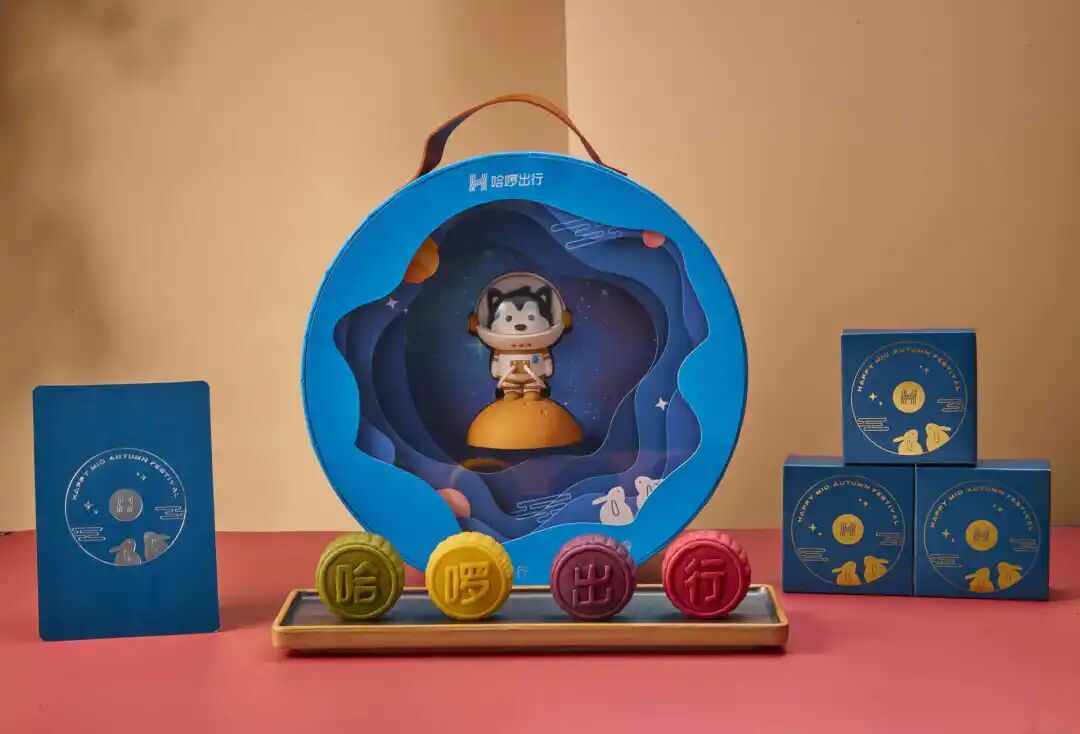 哈啰出行打造了一个深邃星球模样的中秋月饼,四块流心月饼包围着一只太空探月哈士奇。