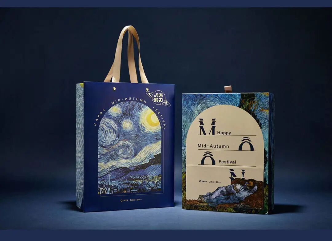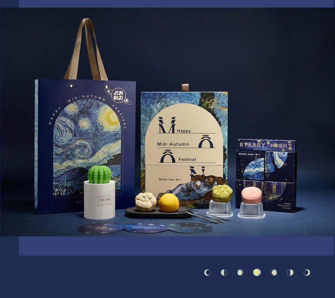 月饼以月有影力为主题,将《星夜》、《罗纳河上的星夜》、《有柏树和星星的道路》等梵高经典画作融入结构设计之中。复古艺术的浪漫已尽数体现~