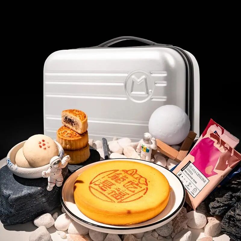 月饼、跳棋、置物盘,以朦胧质感亚克力手提箱的包装形式组成了月光月饼。