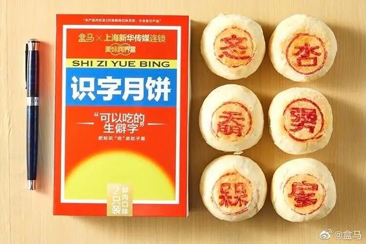 盒马与上海新华传媒合作,推出【识字月饼】月饼,在饼面上印生僻字,不仅喂你吃的,还要给你科普读法和释义。