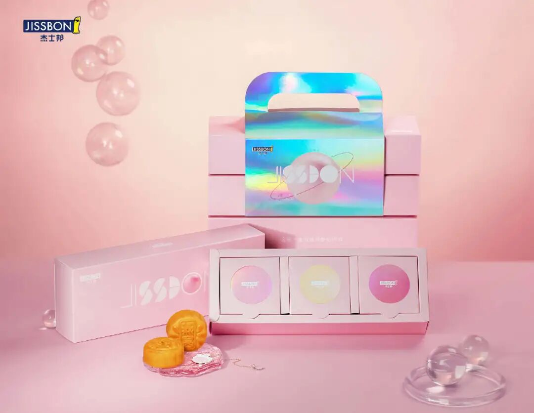 4款小清新色调方盒子,装着蜜桃乌龙、脐橙麻薯、酸奶椰果等口味月饼。