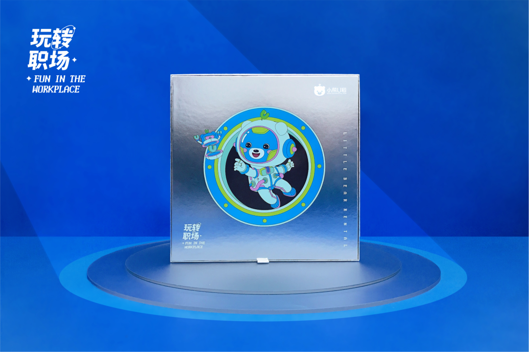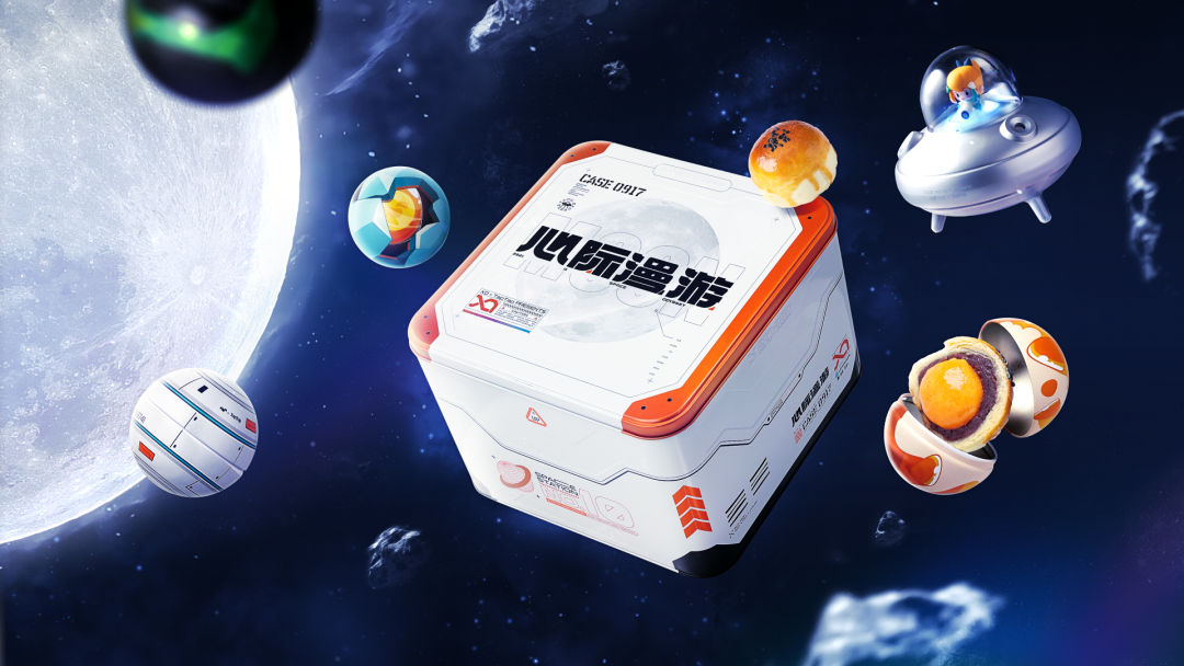 月饼以身着荧光太空服的小熊和UU机器人为主形象,辅以太空舱、飞船、月球场景画面增强太空氛围,银色镭射质感凸显未来感~