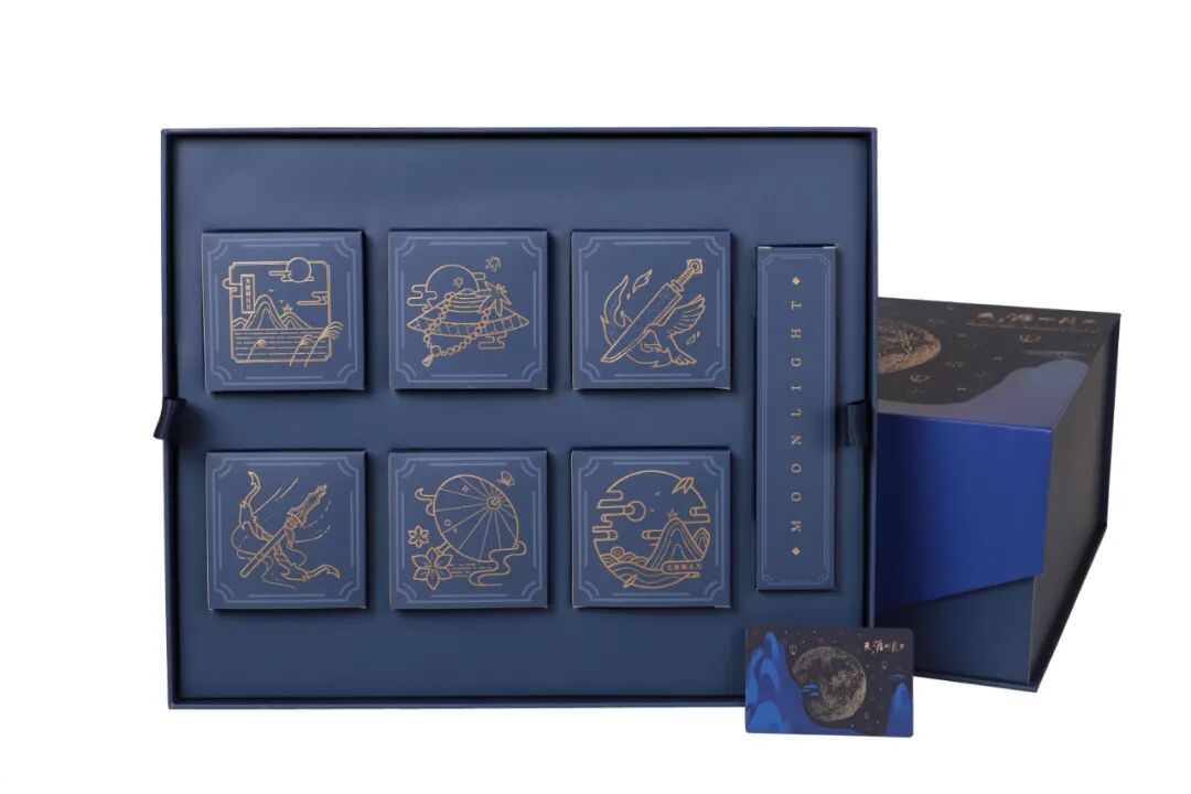 本次月饼月饼外包装采用了天刀经典的朝霞元素,深蓝色外包装华丽大气。内部单月饼包装的图案选择,则是以门派为主题。古朴典雅的设计搭配奢华的烫金工艺,手感细腻、质感。无论是自用还是送人都超有排面,你值得保有!