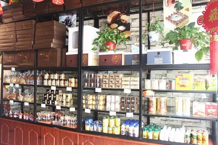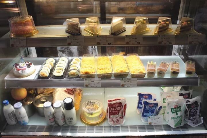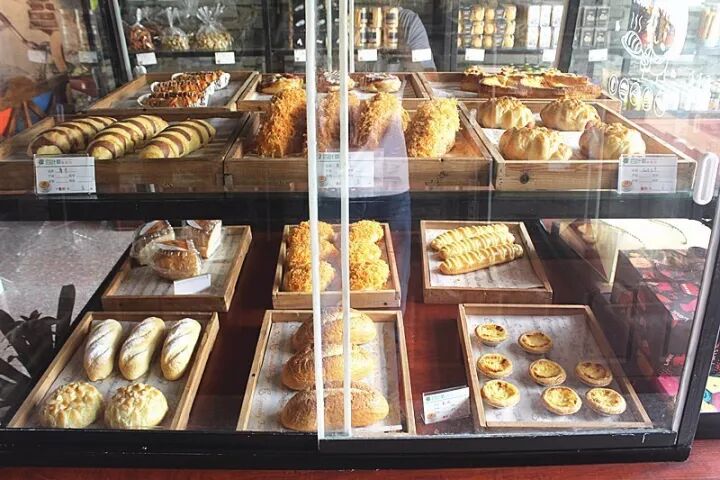 透过店门,店铺内显得工整而又质朴,干净整洁的橱窗里摆放着让人垂涎三尺的烘焙产品,还有各种饮品和甜食,供各位朋友们选择。