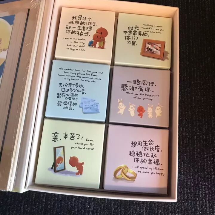 同样也是主打亲情温情牌,只是结构设计感和配色有点...一言难尽。但盒子底部的寄语还是蛮感人的。
