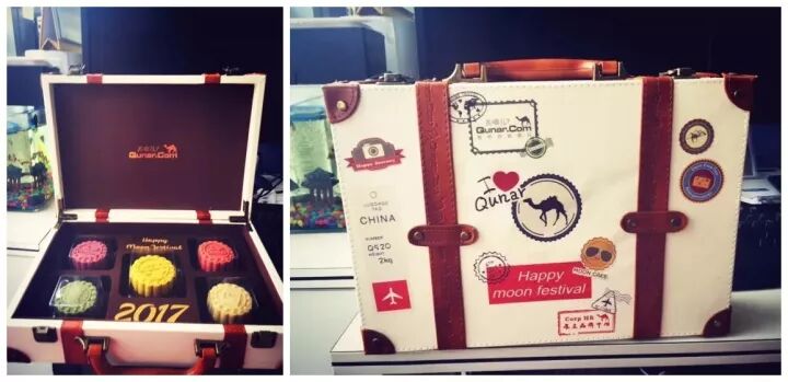 月饼礼盒做成行李箱的造型,与去哪儿网的满世界游玩的特点相符,可谓是非常形象的一款月饼了。