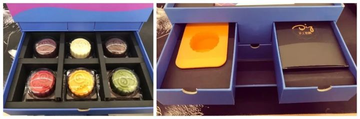 月饼盒设计成了抽屉式。上面两个小抽屉里有月饼的制作材料,你可以自己动手diy。要是想吃现成的,下层抽屉里也有六枚印着陌陌logo的小月饼。可以说是非常贴心了。
