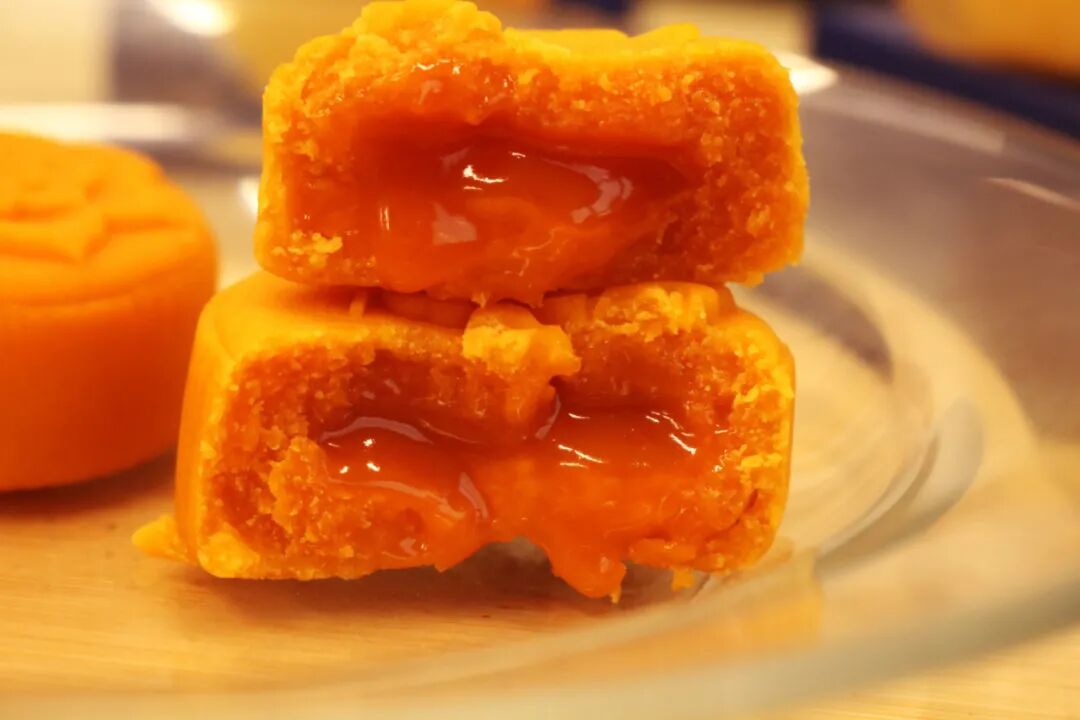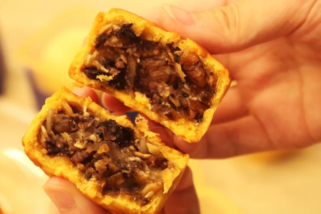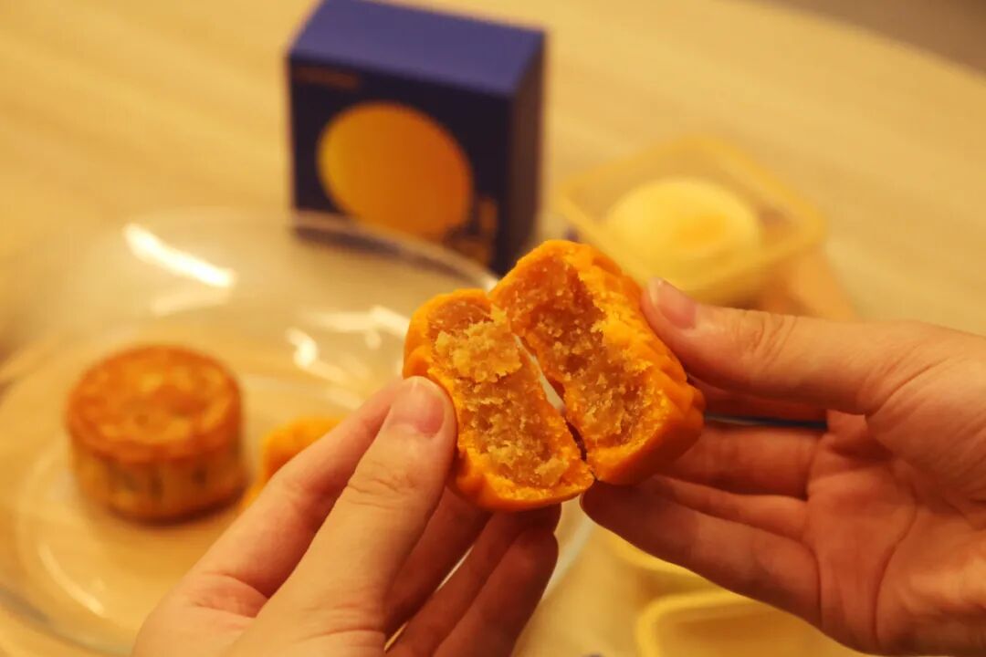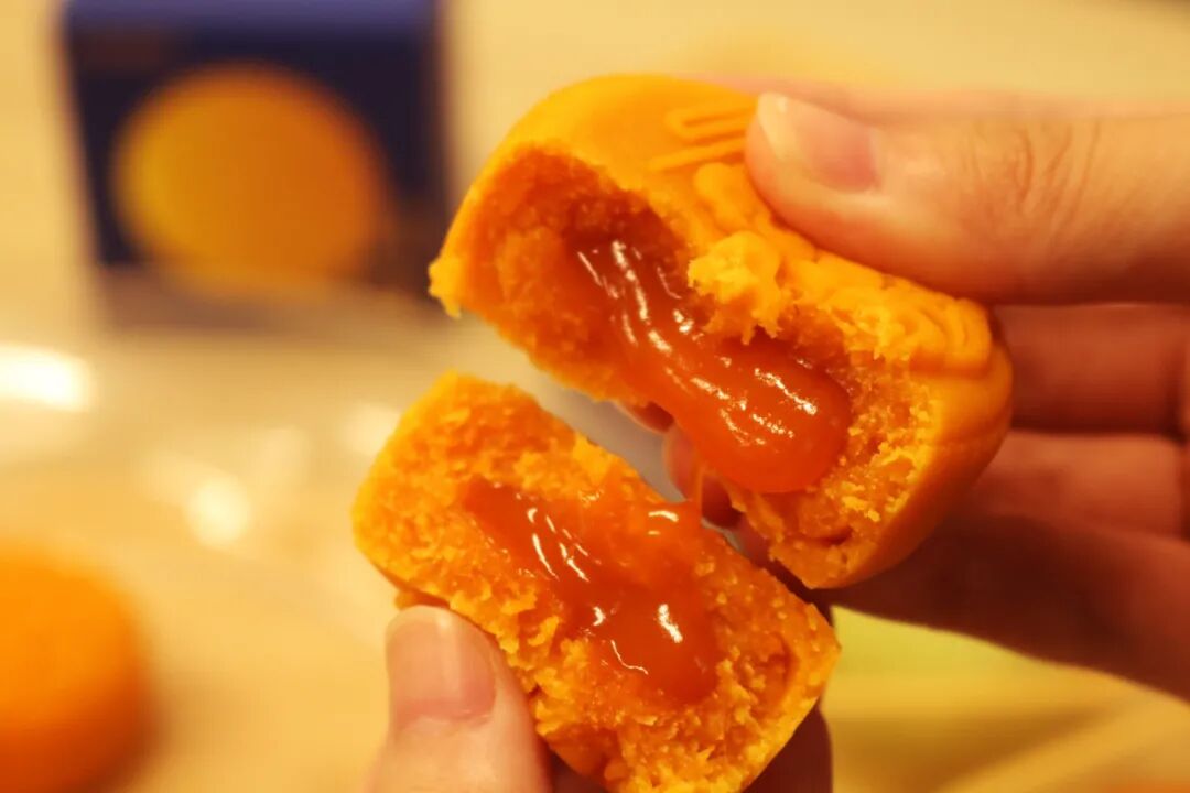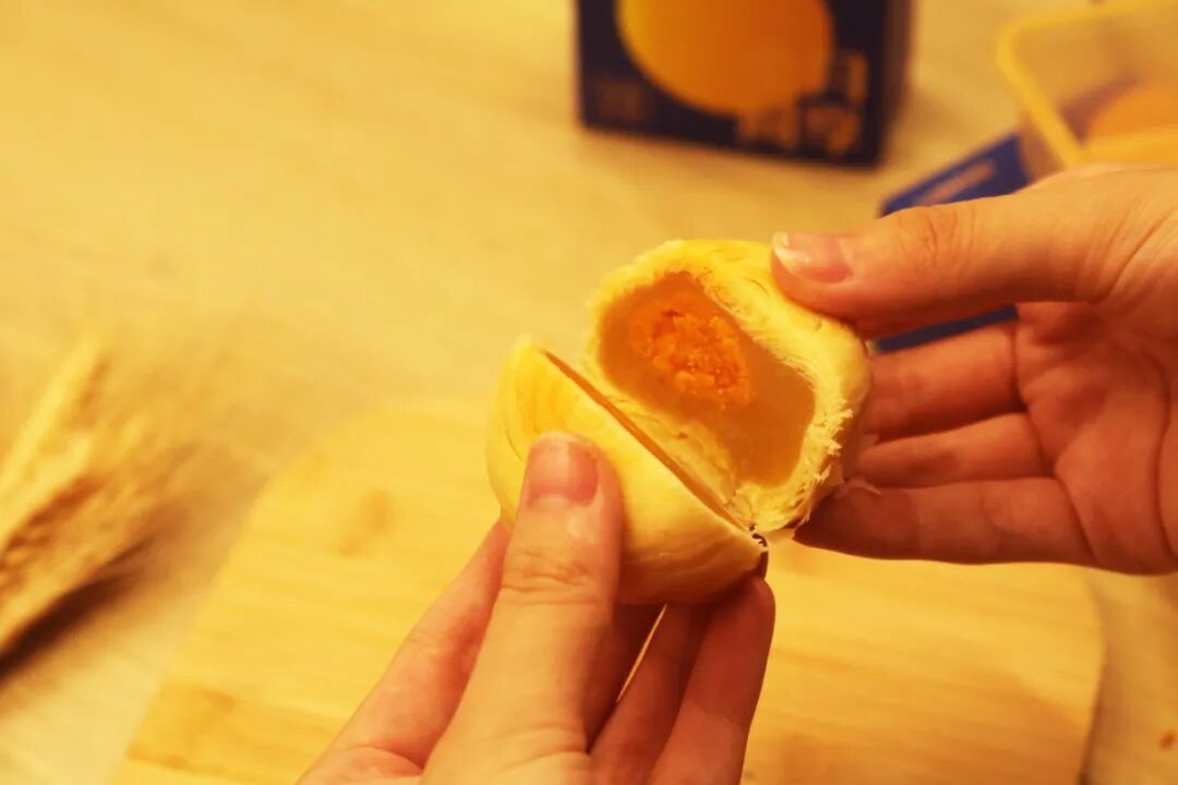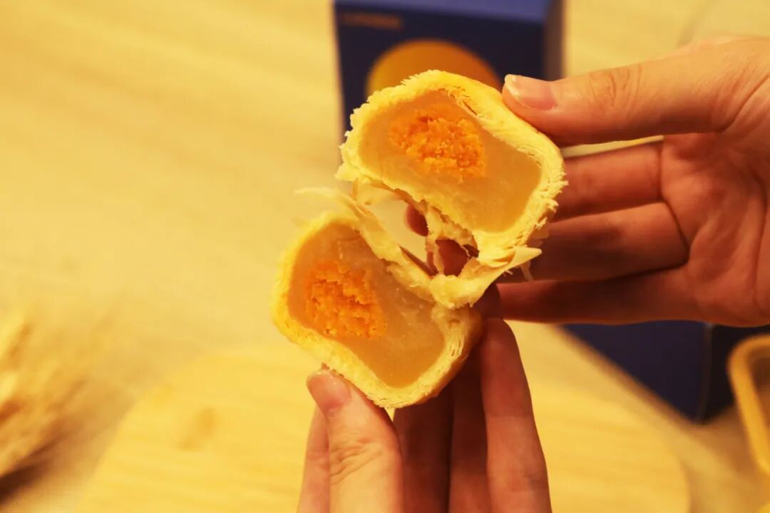 饼皮被烤制得焦黄诱人,拿起一枚,用手轻轻掰开,浓香的奶黄从里面流出,扑鼻的奶香让人忍不住咽口水,简直是视觉和嗅觉的双重体验。