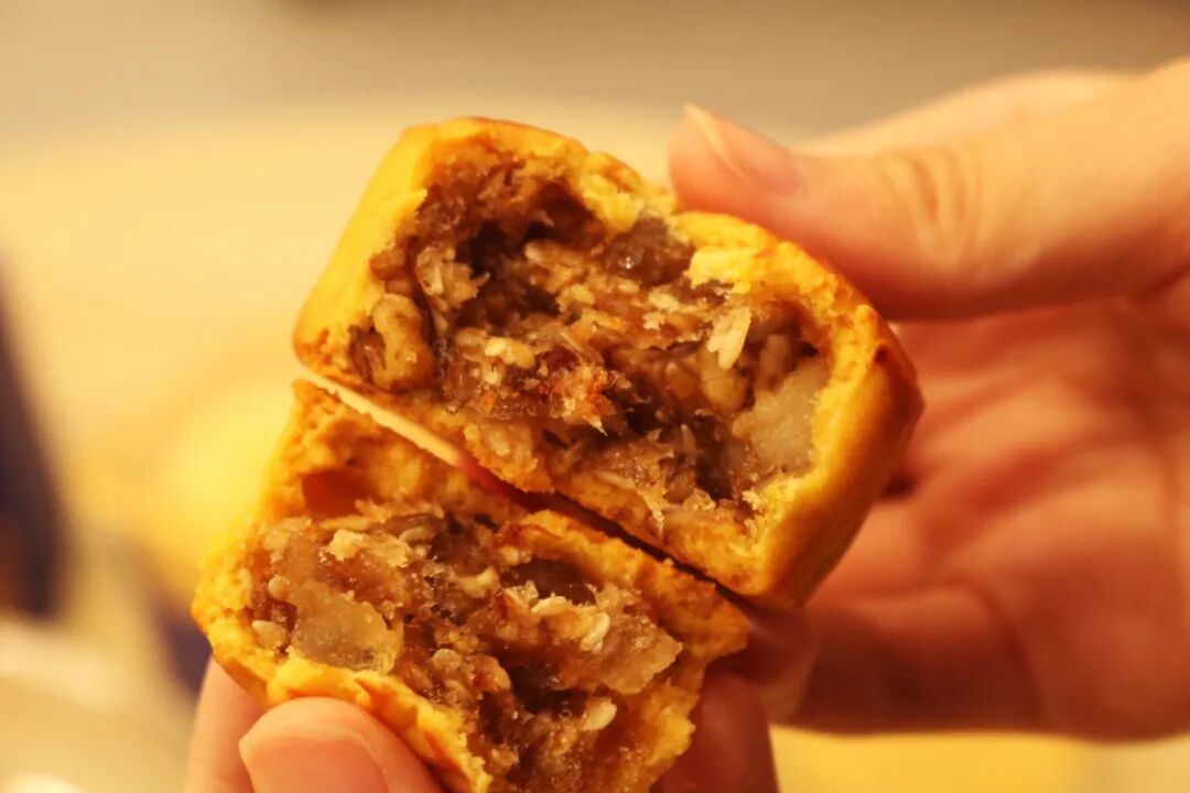 里面都是大颗的核桃仁、杏仁、橄榄仁…..还有白芝麻、瓜子仁、冬瓜蓉、糖桔饼等,多达十几种健康食材,馅料饱满,多种果仁香味相辅相成。